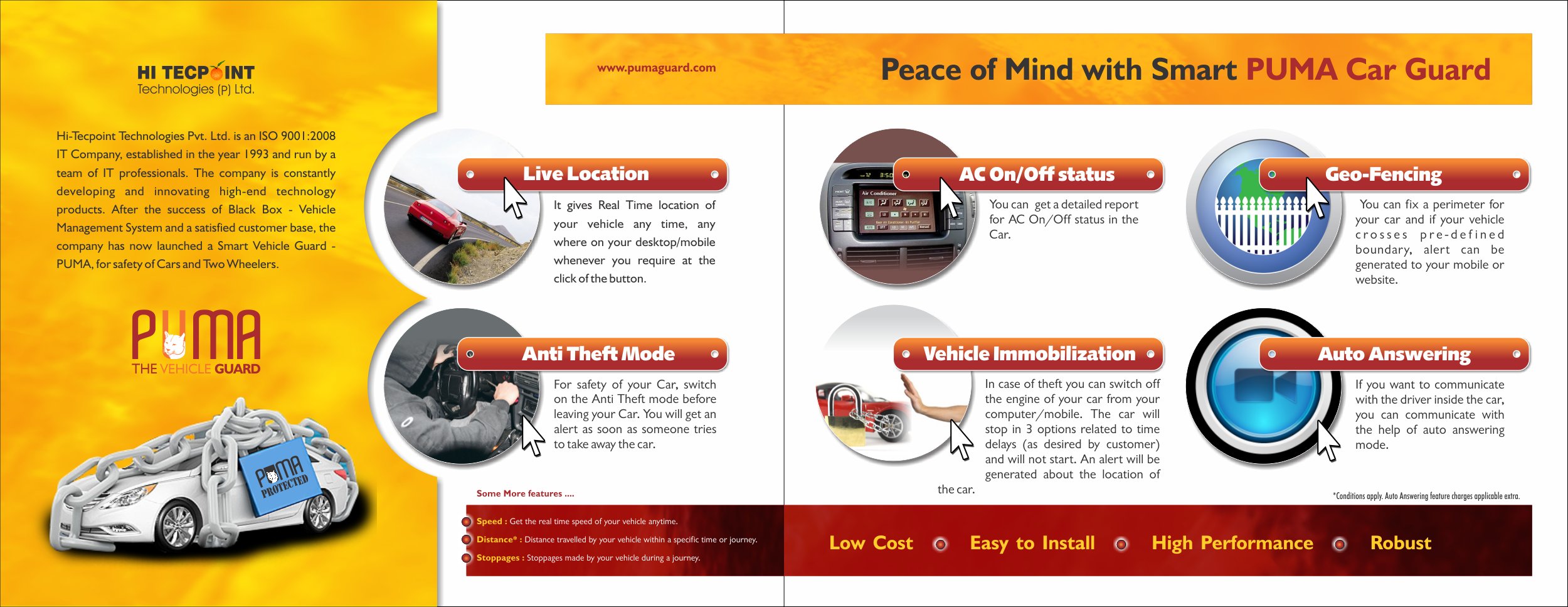 Recently we designed a 2 fold brochure our client PUMA, which is a GPS Based Vehicle Tracking Device. Claimed to be the best Anti Theft Device for Cars & Bikes, PUMA is selling like hot cakes. Excellent device to be sure and have peace of mind for your vehicles.